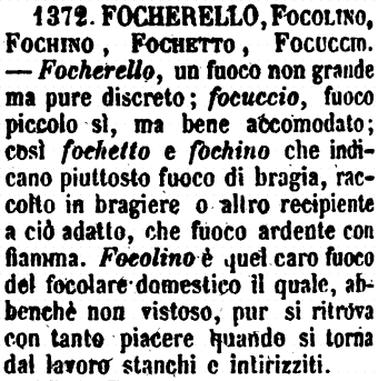 | Focherello, Focolino, Fochino, Fochetto, Focuccio - Focherello, un fuoco non grande ma pure discreto; focuccio, fuoco piccolo sì, ma bene accomodato; così fochetto e fochino che indicano piuttosto fuoco di bragia, raccolto in bragiere o altro recipiente a ciò adatto, che fuoco ardente con fiamma. Focolino è quel caro fuoco del focolare domestico il quale, abbenchè non vistoso, pur si ritrova con tanto piacere quando si torna dal lavoro stanchi e intirizziti. [immagine] |