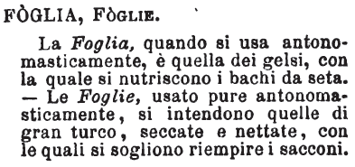 Foglia, Foglie - La Foglia, quando si usa antonomasticamente, è quella dei gelsi, con la quale si nutriscono i bachi da seta.