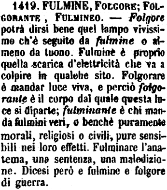 Fulmine, Folgore; Folgorante, Fulmineo - Folgore potrà dirsi bene quel lampo vivissimo ch'è seguito da fulmine o almeno da tuono. Fulmine è proprio quella scarica d'elettricità che va a colpire in qualche sito. Folgorare è mandar luce viva, e perciò folgorante è il corpo dal quale questa luce si diparte; fulminante è chi manda fulmini veri, o benchè puramente morali, religiosi o civili, pure sensibili nei loro effetti. Fulminare l'anatema, una sentenza, una maledizione. Dicesi però e fulmine e folgore di guerra. [immagine]