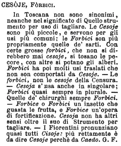 | Cesoje, Forbici - In Toscana non sono sinonimi, neanche nel significato di Quello strumento per uso di tagliare. Le Cesoje sono più piccole, e servono per gli usi più comuni; le Forbici son più propriamente quelle de' sarti. Con certe grosse forbici, che non si direbbero mai cesoje, si tosano le pecore, con altre si potano gli alberi. Forbici ha poi molti usi traslati che non son comportati da Cesoje. - Le forbici, non le cesoje della Censura. - Cesoja s'usa anche in singolare; Forbici quasi sempre in plurale. - Quelle de' chirurghi sempre Forbici. - Forbice o Forbici un insetto che guasta le frutta, e Forbice un'opera di fortificazione. Cesoja non ha altri sensi oltre il suo di Strumento per tagliare. - I Fiorentini pronunziano quasi tutti Cisoje: più rettamente è da dire Cesoje perchè da Caedo. G.F. [immagine] |