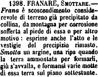 Franare, Smottare - Frana è scoscendimento considerevole di terreno già precipitato da collina, da montagna per corrosione sofferta al piede di essa o per altro motivo: esprime anche l'atto e le vestigie del precipizio rimasto. Smotta un argine, una ripa quando la terra ammontata per formarli, giù s'avvalla, e formansi varie motte di essa terra sul piano sottostante. [immagine]