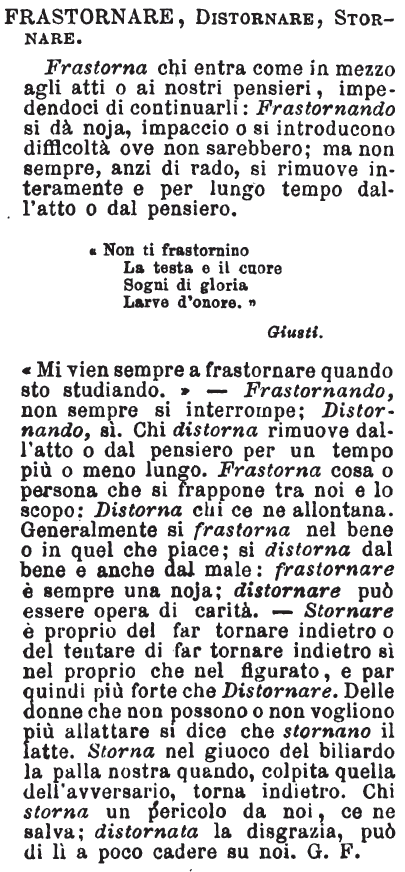 | Frastornare, Distornare - Frastorna, persona, cosa o pensiero che s'intrometta nel buono che uno fa o pensa a qualche affare o lavoro. Distorna, persona o pensiero che distoglie dal fare o dal seguitare cosa cominciata. Cosa che ci frastorna è sempre una seccatura, una noia; cosa che ci distorna può essere anche un sollievo e talvolta un benefizio se l'impresa era dannosa e dannevole. Frastornare meglio si dice dell'attenzione; distornare, dell'opera. Distornare però, se ho da dirla, mi sembra parola di conio francese, ed essere la letterale traduzione di détourner; io preferirei stornare o distogliere secondo i casi. Ma qui a proposito di queste parole che san di francese voglio mettere un mio pensiero e dire: siamo noi Italiani che tante parole somiglianti ed omofone pigliammo da' Francesi, o essi da noi? Bellissima opera sarebbe quella della storia comparata delle due lingue e vedere quali dei rispettivi loro vocaboli sono proprii di una e quali dell'altra; quali hanno comune l'origine nel latino, nel greco o in altra lingua antica; quali finalmente, vista e riconosciuta l'anteriorità loro in una delle due lingue, compulsando i libri e i documenti classici di entrambe, possano dirsi con verità tolte da una all'altra (1).