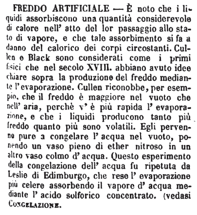 | Freddo artificiale - E' noto che i liquidi assorbiscono una quantità considerevole di calore nell'atto del lor passaggio allo stato di vapore, e che tale assorbimento si fa a danno del calorico dei corpi circostanti. Cullen e Black sono considerati come i primi fisici che nel secolo XVIII. abbiano avuto idee chiare sopra la produzione del freddo mediante l'evaporazione. Cullen riconobbe, per esempio, che il freddo è maggiore nel vuoto che nell'aria, perchè v'è più rapida l'evaporazione, e che i liquidi producono tanto più freddo quanto più sono volatili. Egli pervenne pure a congelare l'acqua nel vuoto, ponendo un vaso pieno di ether nitroso in un altro vaso colmo d'acqua. Questo esperimento della congelazione dell'acqua fu ripetuta da Leslie di Edimburgo, che rese l'evaporazione più celere assorbendo il vapore d'acqua mediante l'acido solforico concentrato. (vedasi Congelazione. [immagine] |