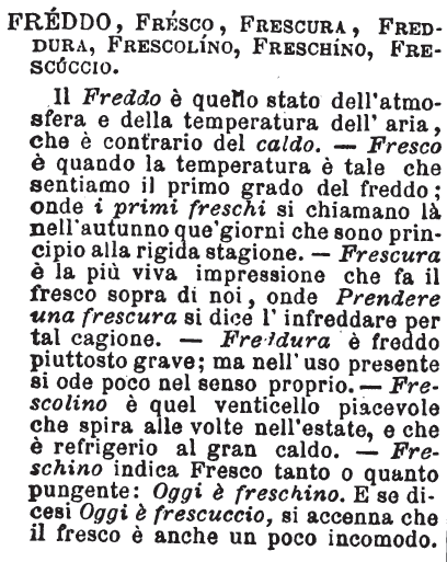 | Freddo, Fresco, Frescura, Freddura, Frescolino, Freschino, Frescuccio - Il Freddo è quello stato dell'atmosfera e della temperatura dell'aria, che è contrario del caldo. - Fresco è quando la temperatura è tale che sentiamo il primo grado del freddo; onde i primi freschi si chiamano là nell'autunno que' giorni che sono principio alla rigida stagione. - Frescura è la più viva impressione che fa il fresco sopra di noi, onde Prendere una frescura si dice l'infreddare per tal cagione. - Freddura è freddo piuttosto grave; ma nell'uso presente si ode poco nel senso proprio. - Frescolino è quel venticello piacevole che spira alle volte nell'estate, e che è refrigerio al gran caldo. - Freschino indica Fresco tanto o quanto pungente: Oggi è freschino. E se dicesi Oggi è frescuccio, si accenna che il fresco è anche un poco incomodo. [immagine] |