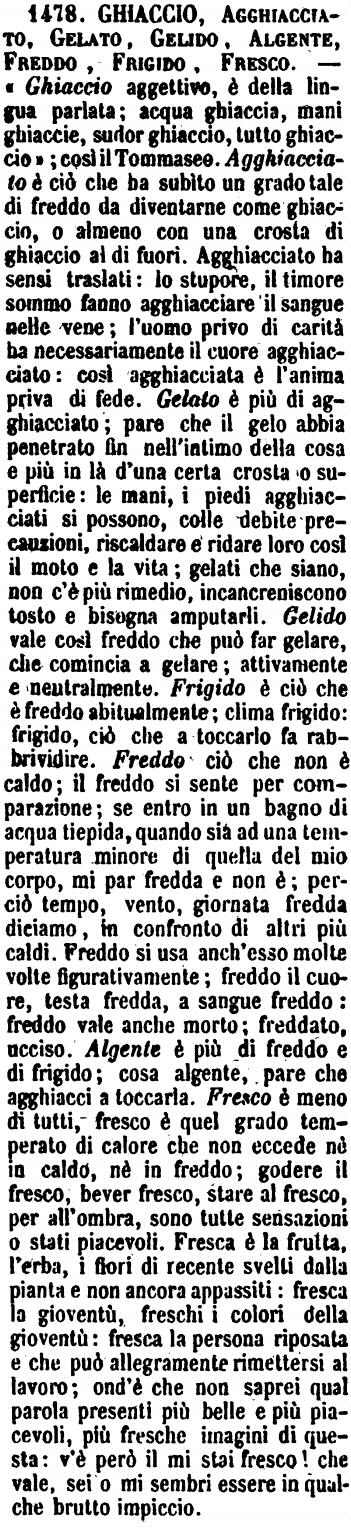 | Ghiaccio, Agghiacciato, Gelato, Gelido, Algente, Freddo, Frigido, Fresco - «Ghiaccio aggettivo, è delle lingua parlata; acqua ghiaccia, mani ghiaccie, sudor ghiaccio, tutto ghiaccio»; così il Tommaseo. Agghiacciato è ciò che ha subìto un grado tale di freddo da diventarne come ghiaccio, o almeno con una crosta di ghiaccio al di fuori. Agghiacciato ha sensi traslati: lo stupore, il timore sommo fanno agghiacciare il sangue nelle vene; l'uomo privo di carità ha necessariamente il cuore agghiacciato: così agghiacciata è l'anima priva di fede. Gelato è più di agghiacciato; pare che il gelo abbia penetrato fin nell'intimo della cosa e più in là d'una certa crosta o superficie: le mani, i piedi agghiacciati si possono, colle debite precauzioni, riscaldare e ridare loro così il moto e la vita; gelati che siano, non c'è più rimedio, incancreniscono tosto e bisogna amputarli. Gelido vale così freddo che può far gelare, che comincia a gelare; attivamente e neutralmente. Frigido è ciò che è freddo abitualmente; clima frigido: frigido, ciò che a toccarlo fa rabbrividire. Freddo ciò che non è caldo; il freddo si sente per comparazione; se entro in un bagno di acqua tiepida, quando sia ad una temperatura minore di quella del mio corpo, mi par fredda e non è; perciò tempo, vento, giornata fredda diciamo, in confronto di altri più caldi. Freddo si usa anch'esso molte volte figurativamente; freddo il cuore, testa fredda, a sangue freddo: freddo vale anche morto; freddato, ucciso. Algente è più di freddo e di frigido; cosa algente, pare che agghiacci a toccarla. Fresco è meno di tutti, fresco è quel grado temperato di calore che non eccede nè in caldo, nè in freddo; godere il fresco, bever fresco, stare al fresco, per all'ombra, sono tutte sensazioni o stati piacevoli. Fresca è la frutta, l'erba, i fiori di recente svelti dalla pianta e non ancora appassiti: fresca la gioventù, freschi i colori della gioventù: fresca la persona riposata e che può allegramente rimettersi al lavoro; ond'è che non saprei qual parola presenti più belle e più piacevoli, più fresche imagini di questa: v'è però il mi stai fresco! che vale, sei o mi sembri essere in qualche brutto impiccio. [immagine] |