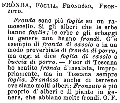Fronda, Foglia, Frondoso, Fronzuto - Fronda sono più foglie su un ramoscello. Sì gli alberi che le erbe hanno foglie; le erbe e gli erbaggi in genere non hanno frondi. C'è esempio di fronda di cavolo e in un modo proverbiale di fronda di porro, ma oggi si dice foglia di cavolo e buccia di porro. - Fuor di Toscana ho sentito fronda d'insalata, impropriamente, ma in Toscana sempre foglia. Frondoso anche di terreno ove siano molti alberi; Fronzuto è più proprio d'alberi e di piante in genere, che abbiano molte frondi. G. F. [immagine]