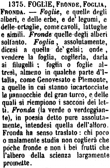 Foglie, Fronde, Foglia, Fronda - Foglia, e quelle degli alberi, e delle erbe, e de' legumi, e delle ortaglie, come cavoli, lattughe e simili. Fronde quelle degli alberi soltanto. Foglia, assolutamente, dicesi a quella de' gelsi; onde, vendere la foglia, coglierla, darla ai filugelli; foglia o foglie altresì, almeno in qualche parte d'Italia, come Genovesato e Piemonte, a quelle in cui stanno incartocciate le pannocchie del gran turno, e delle quali si riempiono i sacconi dei letti. Fronda (la verde o verdeggiante), in poesia detto pure assolutamente, intendesi quella dell'alloro. Fronda ha senso traslato: chi poco o malamente studia non coglierà che poche fronde e non i bei frutti che l'albero della scienza largamente promette. [immagine]