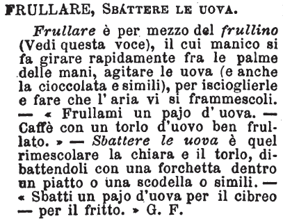 Frullare, Sbattere le uova - Frullare è per mezzo del frullino (Vedi questa voce), il cui manico si fa girare rapidamente fra le palme delle mani, agitare le uova (e anche la cioccolata e simili), per iscioglierle e fare che l'aria vi si frammescoli. - «Frullami un pajo d'uova. - Caffè con un torlo d'uovo ben frullato.» Sbattere le uova è quel rimescolare la chiara e il torlo, dibattendoli con una forchetta dentro un piatto o una scodella o simili. - «Sbatti un pajo d'uova per il cibreo - per il fritto.» G. F. [immagine]