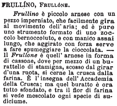 Frullino, Frullone - Frullino è piccolo arnese con un pezzo imperniato, che facilmente gira al movimento dell'aria; ed è pure uno strumento formato di uno zoccolo bernoccoluto, e con manico assai lungo, che aggirato con forza serve a fare spumeggiare la cioccolata. - Il Frullone è quell'arnese in forma di cassone, dove per mezzo di un burattello di stamigna, scosso dal girar d'una ruota, si cerne la crusca dalla farina. È l'insegna dell'Accademia della Crusca; ma quel buratto è ora tutto sfondato, e tra il fior di farina si vede mescolato ogni specie di sudiciume. [immagine]