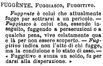 | Fuggente, Fuggiasco, Fuggitivo - Fuggente è colui che attualmente fugge per sottrarsi a un pericolo. - Fuggiasco è colui che, essendo inseguito, fuggendo a persecuzioni o a qualche pena, vive celatamente qua e là per non essere scoperto. - Fuggitivo indica non l'atto di chi fugge, ma la condizione e lo stato di esso. - «Fuggitivo e senza un soldo, fu per darsi alla disperazione.» [immagine] |
