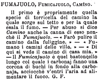 Fumajolo, Fumicajuolo, Camino - Il primo è propriamente quella specie di torricella del camino la quale sorge sul tetto e per la quale esale il fumo. - Per abuso si dice Camino anche la canna di esso nonchè il Fumajuolo. - «Farò pulire il camino dalla fuliggine.» -«Fumano i camini delle ville.» - «Di qui si vede il camino di casa mia.» - Il Fumicajuolo è quel bastoncello lungo col quale i carbonaj fanno una corona di buchi in fondo alla carbonaja, acciocchè v'entri l'aria ad alimentare il fuoco. G. F. [immagine]