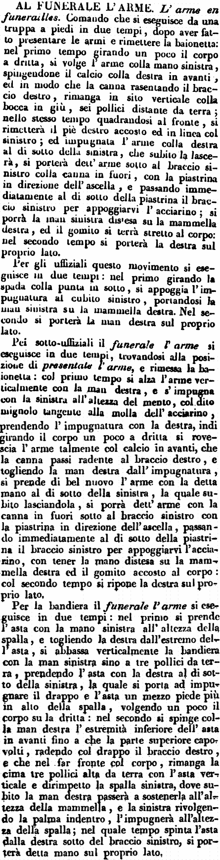 Al funerale l'arme - L'arme en funerailles. Comando che si eseguisce da una truppa a piedi in due tempi, dopo aver fatto presentare le armi e rimettere la baionetta: nel primo tempo girando un poco il corpo a dritta, si volge l'arme colla mano sinistra, spingendone il calcio colla destra in avanti, ed in modo che la canna rasentando il braccio destro, rimanga in sito verticale colla bocca in giù, sei pollici distante da terra; nello stesso tempo quadrandosi al fronte, si rimetterà il piè destro accosto ed in linea col sinistro; ed impugnata l'arme colla destra al di sotto della sinistra, che subito la lascerà, si porterà dett'arme sotto al braccio sinistro colla canna in fuori, con la piastrina in direzione dell'ascella, e passando immediatamente al di sotto della piastrina il braccio sinistro per appoggiarvi l'acciarino; si porrà la man sinistra distesa su la mammella destra, ed il gomito si terrà stretto al corpo: nel secondo tempo si porterà la destra sul proprio lato.