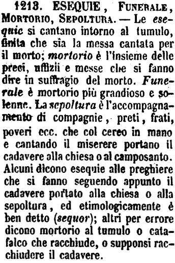 Esequie, Funerale, Mortorio, Sepoltura - «Le Esequie si cantano intorno al tumulo, finita che sia la messa cantata per il morto. - Mortorio è l'insieme delle preci, uffizii e messe che si fanno dire in suffragio del morto. - Funerale è mortorio più grandioso e solenne. - La Sepoltura è l'accompagnamento di compagnie, preti, frati, poveri, ecc., che col cero in mano e cantando il Miserere portano il cadavere alla chiesa o al camposanto. Alcuni dicono Esequie alle preghiere che si fanno seguendo appunto il cadavere portato alla chiesa o alla sepoltura, ed etimologicamente è ben detto (sequor); altri per errore dicono Mortorio al tumulo o catafalco che racchiude, o supponsi racchiudere, il cadavere.»