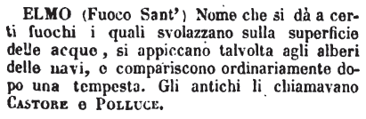 | Elmo (Fuoco di Sant’) - Nome che si dà a certi fuochi i quali svolazzano sulla superficie delle acque, si appiccicano talvolta agli alberi delle navi, o compariscono ordinariamente dopo una tempesta. Gli antichi li chiamavano Castore e Polluce. [immagine] |