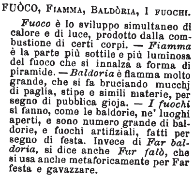 «Falò è fuoco di materie combustibili che faccia gran fiamma, ma di breve durata. Si usa in traslato, dicendo che uno ha fatto un falò delle sue entrate e delle sue possessioni, per indicare averle lui in breve consumate. Baldoria ha presso a poco lo stesso significato, se non che pare che sia fiamma anco di più breve durata. La baldoria e il falò sono fuochi che si fanno in occasione di allegrezza. Anco in significato di rallegrarsi di alcun prospero avvenimento, diremo: fare baldoria, o le baldorie; fuoco o fuochi. Fuochi diconsi ancora quelle fiamme che si accendono per dare segnali; e chiamansi anche luminarie. Fiammata è fiamma passeggera e momentanea; e sebbene tal voce manchi al vocabolario, è di uso comunissimo ». Cioni. «Torre o pigliare una fiammata dicesi ogni giorno in senso di far bruciare un fascinotto sul caminetto per iscaldarsi un momento, o per asciugarsi». Capponi. Far baldoria è scialare, schiamazzare, mangiare e bere allegramente senza pensiero dell'indomani, del come anderà a finire; la baldoria accenna forse qui al caldo dell'allegria, ai fumi del vino. [immagine] |
