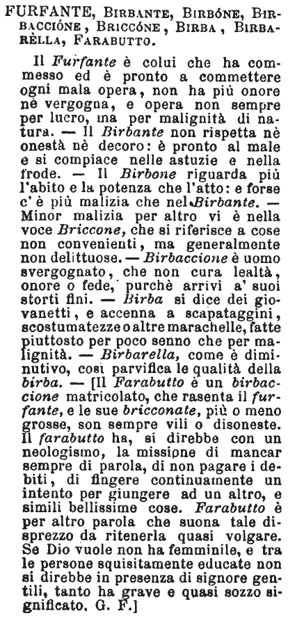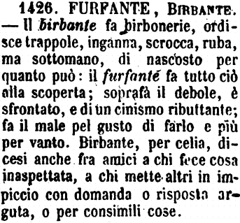 | Furfante, Birbante - Il birbante fa birbonerie, ordisce trappole, inganna, scrocca, ruba, ma sottomano, di nascosto per quanto può: il furfante fa tutto ciò alla scoperta; soprafà il debole, è sfrontato, e di un cinismo ributtante; fa il male pel gusto di farlo e più per vanto. Birbante, per celia, dicesi anche fra amici a chi fece cosa inaspettata, a chi mette altri in impiccio con domanda o risposta arguta, o per consimili cose. [immagine] |