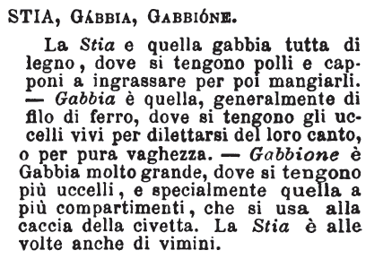 Stia, Gabbia, Gabbione - La Stia e quella gabbia tutta di legno, dove si tengono polli e capponi a ingrassare per poi mangiarli. - Gabbia è quella, generalmente di filo di ferro, dove si tengono gli uccelli vivi per dilettarsi del loro canto, o per pura vaghezza. - Gabbione è Gabbia molto grande, dove si tengono più uccelli, e specialmente quella a più compartimenti, che si usa alla caccia della civetta. La Stia è alle volte anche di vimini. [immagine]