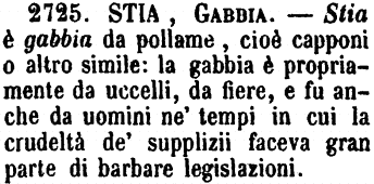 Stia, Gabbia - Stia è gabbia da pollame, cioè capponi o altro simile: la gabbia è propriamente da uccelli, da fiere, e fu anche da uomini ne' tempi in cui la crudeltà de' supplizii faceva gran parte di barbare legislazioni. [immagine]