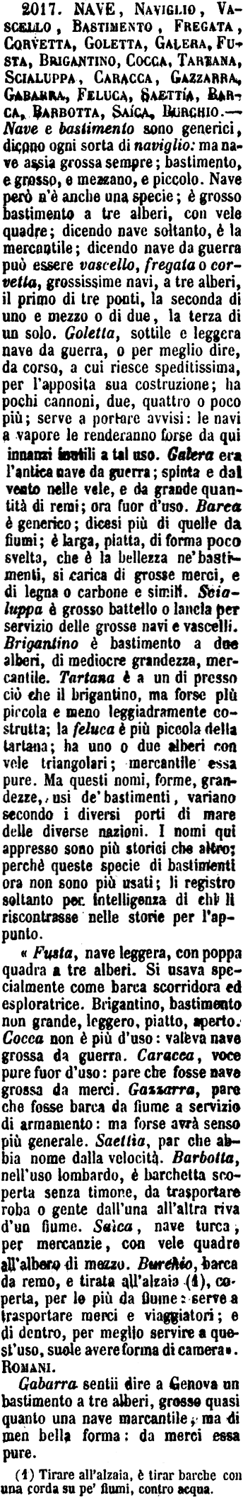 «Fusta, nave leggera, con poppa quadra a tre alberi. Si usava specialmente come barca scorridora ed esploratrice. Brigantino, bastimento non grande, leggero, piatto, aperto. Cocca non è più d'uso: valeva nave grossa da guerra. Caracca, voce pure fuor d'uso: pare che fosse nave grossa da merci. Gazzarra, pare che fosse barca da fiume a servizio di armamento: ma forse avrà senso più generale. Saettìa, par che abbia nome dalla velocità. Barbotta, nell'uso lombardo, è barchetta scoperta senza timone, da trasportare roba o gente dall'una all'altra riva d'un fiume. Saìca, nave turca, per mercanzie, con vele quadre all'albero di mezzo. Burchio, barca da remo, e tirata all'alzaia (1), coperta, per lo più da fiume: serve a trasportare merci e viaggiatori; e di dentro, per meglio servire a quest'uso, suole avere forma di camera». Romani.