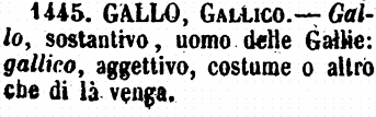 | Gallo, Gallico - Gallo, sostantivo, uomo delle Gallie: gallico, aggettivo, costume o altro che di là venga. [immagine] |