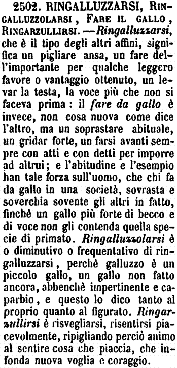 | Ringalluzzarsi, Ringalluzzolarsi, Fare il gallo, Ringarzullirsi - Ringalluzzarsi, che è il tipo degli altri affini, significa un pigliare ansa, un fare dell'importante per qualche leggero favore o vantaggio ottenuto, un levar la testa, la voce più che non si faceva prima: il fare da gallo è invece, non cosa nuova come dice l'altro, ma un soprastare abituale, un gridar forte, un farsi avanti sempre con atti e con detti per imporre ad altrui; e l'abitudine e l'esempio han tale forza sull'uomo, che chi fa da gallo in una società, sovrasta e soverchia sovente gli altri in fatto, finchè un gallo più forte di becco e di voce non gli contenda quella specie di primato. Ringalluzzolarsi è o diminutivo o frequentativo di ringalluzzarsi, perchè galluzzo è un piccolo gallo, un gallo non fatto ancora, abbenchè impertinente e caparbio, e questo lo dico tanto al proprio quanto al figurato. Ringarzullirsi è risvegliarsi, risentirsi piacevolmente, ripigliando perciò animo al sentire cosa che piaccia, che infonda nuova voglia e coraggio. [immagine] |