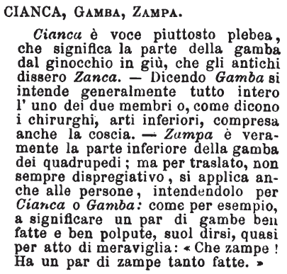 | Cianca, Gamba, Zampa - Cianca è voce piuttosto plebea, che significa la parte della gamba dal ginocchio in giù, che gli antichi dissero Zanca. - Dicendo Gamba si intende generalmente tutto intero l'uno dei due membri o, come dicono i chirurghi, arti inferiori, compresa anche la coscia. - Zampa è veramente la parte inferiore della gamba dei quadrupedi; ma per traslato, non sempre dispregiativo, si applica anche alle persone, intendendolo per Cianca o Gamba: come per esempio a significare un par di gambe ben fatte e ben polpute, suol dirsi, quasi per atto di meraviglia: «Che zampe! Ha un par di zampe tanto fatte.» [immagine] |