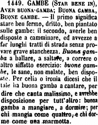| Gambe (star bene in), Avere buona gamba; Buona gamba, Buone gambe - Il primo significa stare ben fermo, dritto, ben piantato sulle gambe: il secondo, averle ben disposte a camminare, ed avvezze a far lunghi tratti di strada senza provare grave stanchezza. Buona gamba a ballare, a saltare, a correre o altro siffatto esercizio: buone gambe, le sane, non malate, ben disposte. Per celia o ironia dicesi che il tale ha buona gamba a cantare, per dire che canta malissimo, e avrebbe disposizione per tutt'altro: buona gamba a mangiare, a dormire; per chi mangia come quattro, e chi dorme come una marmotta. [immagine] |