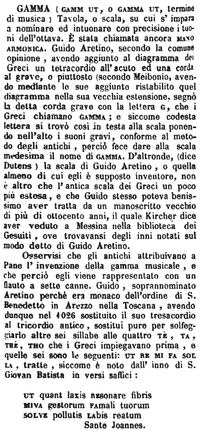 Osservisi che gli antichi attribuivano a Pane l'invenzione della gamma musicale, e che perciò egli viene rappresentato con un flauto a sette canne. Guido, soprannominato Aretino perchè era monaco dell'ordine di S. Benedetto in Arezzo nella Toscana, avendo dunque nel 1026 sostituito il suo tresacordio al tricordio antico, sostituì pure per solfeggiarlo altre sei sillabe alle quattro tè, ta, thè, tho che i Greci impiegavano prima, e quelle sei sono le seguenti: ut re mi fa sol la, tratte, siccome è noto dall'inno di S. Giovan Batista in versi saffici: ut quant laxis resonare fibris miva gestorum famali tuorum solve pollutis labis reatum Sante Joannes. [immagine] |