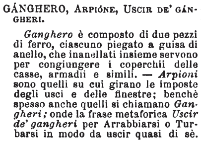 Ganghero, Arpione, Uscir de’ gangheri - Ganghero è composto di due pezzi di ferro, ciascuno piegato a guisa di anello, che inanellati insieme servono per congiungere i coperchii delle casse, armadii e simili. - Arpioni sono quelli su cui girano le imposte degli usci e delle finestre; benchè spesso anche quelli si chiamano Gangheri; onde la frase metaforica Uscir de' gangheri per Arrabbiarsi o Turbarsi in modo da uscir quasi di sè. [immagine]