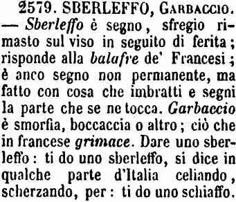 Sberleffo, Garbaccio - Sberleffo è segno, sfregio rimasto sul viso in seguito di ferita; risponde alla balafre de' Francesi; è anco segno non permanente, ma fatto con cosa che imbratti e segni la parte che se ne tocca. Garbaccio è smorfia, boccaccia o altro; ciò che in francese grimace. Dare uno sberleffo: ti do uno sberleffo, si dice in qualche parte d'Italia celiando, scherzando, per: ti do uno schiaffo. [immagine]