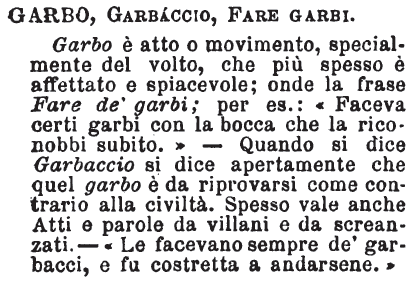 | Garbo, Garbaccio, Fare garbi - Garbo è atto o movimento, specialmente del volto, che più spesso è affettato e spiacevole; onde la frase Fare de' garbi; per es.: «Faceva certi garbi con la bocca che la riconobbi subito.» - Quando si dice Garbaccio si dice apertamente che quel garbo è da riprovarsi come contrario alla civiltà. Spesso vale anche Atti e parole da villani e da screanzati. - «Le facevano sempre de' garbacci, e fu costretta a andarsene.» [immagine] |