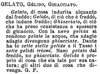 Gelato, Gelido, Ghiacciato - Gelato, di cosa indurita alquanto dal freddo; Gelido, di ciò che è freddo, che induce freddo; Ghiacciato, di ciò che ha preso consistenza e spessore di ghiaccio. COn la neve gelida si rendono gelate le acque, che adagio adagio divengono ghiacciate. Dante ha le sette stelle gelide e il Tasso i sette gelidi trioni. Naso gelato dal freddo, no ghiacciato. Gelido è proprio di cosa che sia tale per sua natura; gli altri due di cosa che divenga. G. F. [immagine]