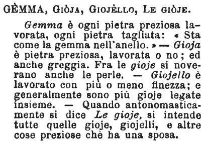 Gemma, Gioja, Giojello, Le gioje - Gemma è ogni pietra preziosa lavorata, ogni pietra tagliata: «Sta come la gemma nell'anello.» - Gioja è pietra preziosa, lavorata o no; ed anche greggia. Fra le gioje si noverano anche le perle. - Giojello è lavorato con più o meno finezza; e generalmente sono più gioje legate insieme. - Quando antonomasticamente si dice Le gioje, si intende tutte quelle gioje, giojelli, e altre cose preziose che ha una sposa. [immagine]