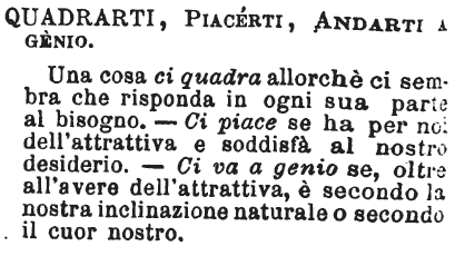 Quadrarti, Piacerti, Andarti a genio - Una cosa ci quadra allorchè ci sembra che risponda in ogni sua parte al bisogno. - Ci piace se ha per noi l'attrattiva e soddisfà al notro desiderio. - Ci va a genio se, oltre all'avere dell'attrattiva, è secondo la nostra inclinazione naturale o secondo il cuor nostro. [immagine]
