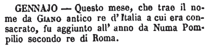 | Gennajo - Questo mese, che trae il nome da Giano antico re d'Italia a cui era consacrato, fu aggiunto all'anno da Numa Pompilio secondo re di Roma. [immagine] |