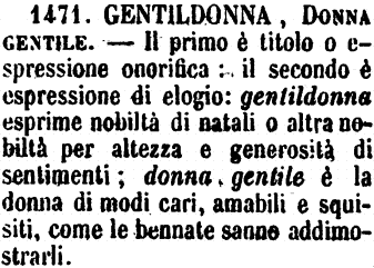 Madama, Madamigella, Madamina, Madonna, Femmina, Gentildonna, Signora, Dama, Donna - Le prime sono prese dal francese, salvo che la terza è di forma diminutiva italiana, ed è un'affettazione: a Milano e a Torino s'ode nel significato del francese Grisette. - « Va dietro alle madamine. - Giudizio con le madamine. » - Madonna fu appellativo di onore nel tempo passato, che oggi si dice Signora. - Gentildonna indica la nobiltà della origine. - Dama indica la presente nobile condizione, o ufficio speciale, come Dama di corte. - La voce Donna, appellativo comune, e di nobile significato, come quello che viene dal latino Domina, a Roma e a Napoli si dà come titolo di nobiltà. - Femmina, chi vuol parlar propriamente, ha significato spregevole, e fu usata anche in senso disonesto; nè certo di una donna onesta e civile si direbbe è una buona femmina. Da ciò si vede quanto è ridicolo il contraffattore della cronica attribuita al Compagni, là dove racconta di certe femmine vergini. [immagine]