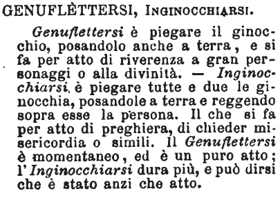 | Genuflettersi, Inginocchiarsi - Genuflettersi è piegare il ginocchio, posandolo anche a terra, e si fa per atto di riverenza a gran personaggi o alla divinità. - Inginocchiarsi è piegare tutte e due le ginocchia, posandole a terra e reggendo sopra esse la persona. Il che si fa per atto di preghiera, di chieder misericordia o simili. Il Genuflettersi è momentaneo, ed è un puro atto; l'Inginocchiarsi dura più, e può dirsi che è stato anzi che atto. [immagine] |