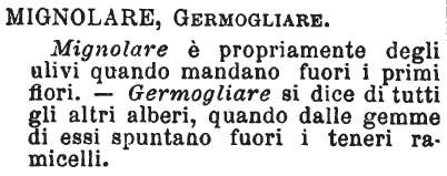 Mignolare, Germogliare - Mignolare è propriamente degli ulivi quando mandano fuori i primi fiori. - Germogliare si dice di tutti gli altri alberi, quando dalle gemme di essi spuntano fuori i teneri ramicelli. [immagine]