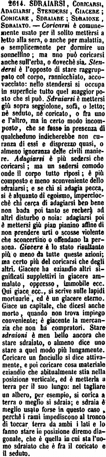 | Sdraiarsi, Coricarsi, Adagiarsi, Stendersi, Giacere; Coricare, Sdraiare; Sdraione, Sdraiato - Coricarsi è comunemente usato per il solito mettersi a letto alla sera, o anche per malattia, e semplicemente per dormire un sonnellino; ma uno può coricarsi anche sull'erba, o dovechè sia. Stendersi è l'opposto di stare raggruppato col corpo, rannicchiato, accovacciato: nello stendersi si occupa in superficie tutto quel maggior posto che si può. Sdraiarsi è mettersi giù sopra seggiolone, sofà, o letto; nè seduto, né coricato, o fra uno e l'altro, ma in certo modo incomposto, che se fosse in presenza di qualcheduno indicherebbe non curanza di essi e disprezzo quasi, o almeno ignoranza delle civili maniere. Adagiarsi è più sedersi che coricarsi; ma un sedersi comodo onde il corpo tutto riposi; è più composto e meno sconveniente dello sdraiarsi; e se chi si adagia pecca, si è alquanto di egoismo, imperciocchè chi cerca di adagiarsi ben bene non bada poi tanto se recherà ad altri disturbo o noia: adagiarsi poi è mettersi giù pian pianino affine di non prendere urti o scosse violente che sconcertino o offendano la persona. Giacere è lo stato risultante più o meno da tutte queste azioni; ma certo più del coricarsi che degli altri. Giacere ha eziandio altri significati supplettivi in giacere ammalato, oppresso, immobile ecc. Qui giace ecc., si scrive sulle lapidi mortuarie, ed è un giacere eterno. Giace un capitale, che dicesi anche morto, quando non trova impiego conveniente; è giacente la mercanzia che non ha compratori. Stare sdraioni è men bello ancora che stare sdraiato, o almeno dice uno stare a quel modo più lungamente. Coricare un fanciullo si dice attivamente, e poi coricare cosa materiale eziandio che abitualmente stia nella posizione verticale, ed è metterla a terra per il suo lungo: nel tagliare un albero, per esempio, si corica a terra o meglio si sdraia; e sdraia è meglio usato forse in questo caso, perché i rami impediscono al tronco di toccar terra da ambi i lati e lo fanno stare in posizione diremo diagonale, che è quella in cui sta l'uomo sdraiato che è fra il coricato e il seduto. [immagine] |