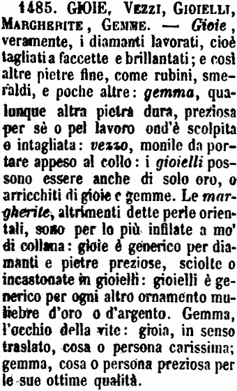 Gioie, Vezzi, Gioielli, Margherite, Gemme - Gioie, veramente, i diamanti lavorati, cioè tagliati a faccette e brillantati; e così altre pietre fine, come rubini, smeraldi, e poche altre: gemma, qualunque altra pietra dura, preziosa per sè o pel lavoro ond'è scolpita e intagliata: vezzo, monile da portare appeso al collo: i gioielli possono essere anche di solo oro, o arricchiti di gioie e gemme. Le margherite, altrimenti dette perle orientali, sono per lo più infilate a mo' di collana: gioie è generico per diamanti e pietre preziose, sciolte o incastonate in gioielli: gioielli è generico per ogni altro ornamento muliebre d'oro o d'argento. Gemma, l'occhio della vite: gioia, in senso traslato, cosa o persona carissima; gemma, cosa o persona preziosa per le sue ottime qualità. [immagine]