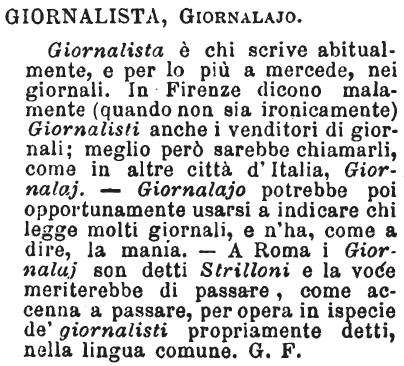 Giornalista, Giornalajo - Giornalista è chi scrive abitualmente, e per lo più a mercede, nei giornali. In Firenze dicono malamente (quando non sia ironicamente) Giornalisti anche i venditori di giornali; meglio però sarebbe chiamarli, come in altre città d'Italia, Giornalaj. - Giornalajo potrebbe poi opportunamente usarsi a indicare chi legge molti giornali, e n'ha, come a dire, la mania. - A Roma i Giornalaj son detti Strilloni e la voce meriterebbe di passare, come accenna a passare, per opera in ispecie de' giornalisti propriamente detti, nella lingua comune. G. F. [immagine]