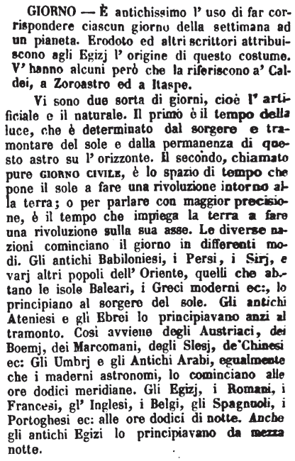 | Giorno - E' antichissimo l'uso di far corrispondere ciascun giorno della settimana ad un pianeta. Erodoto ed altri scrittori attribuiscono agli Egizj l'origine di questo costume. V'hanno alcuni però che la riferiscono a' Caldei, a Zoroastro ed a Itaspe.