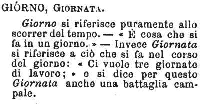| Giorno, Giornata - Giorno si riferisce puramente allo scorrer del tempo. - «È cosa che si fa in un giorno.» - Invece Giornata si riferisce a ciò che si fa nel corso del giorno: «Ci vuole tre giornate di lavoro;» e si dice per questo Giornata anche una battaglia campale. [immagine] |
