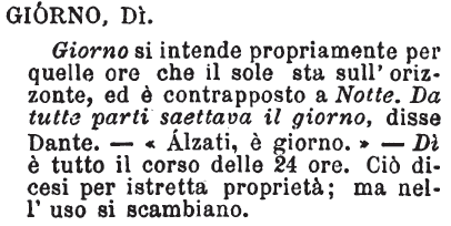 | Giorno, dì - Giorno si intende propriamente per quelle ore che il sole sta sull'orizzonte, ed è contrapposto a Notte. Da tutte parti saettava il giorno, disse Dante. - «Alzati, è giorno.» - Dì è tutto il corso delle 24 ore. Ciò dicesi per istretta proprietà; ma nell'uso si scambiano. [immagine] |