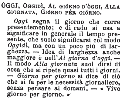 | Oggi, Oggidì, Al giorno d’oggi, Alla giornata, Giorno per giorno - Oggi segna il giorno che corre presentemente; e di rado si usa a significare in generale il tempo presente, che suole significarsi col modo Oggidì, ma con un poco più di larghezza. - Idea di larghezza anche maggiore è nell'Al giorno d'oggi. - Il modo Alla giornata sul dirsi di cosa che si ripete quasi tutti i giorni. - Giorno per giorno si dice di ciò che si fa per le necessità giornaliere, senza pensare al domani. - «Vive giorno per giorno.» [immagine] |