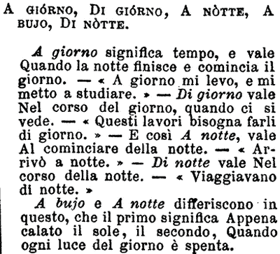 | A giorno, Di giorno, A notte, A bujo, Di notte - A giorno significa tempo, e vale Quando la notte finisce e comincia il giorno. - «A giorno mi levo, e mi metto a studiare.» - Di giorno vale Nel corso del giorno, quando ci si vede. - «Questi lavori bisogna farli di giorno.» - E così A notte, vale Al cominciare della notte. - «Arrivò a notte.» - Di notte vale Nel corso della notte. - «Viaggiavano di notte.»