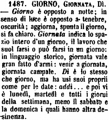 | Giorno, Giornata, Dì - Giorno opposto a notte; in senso di luce è opposto a tenebre, oscurità; aggiorna, spunta il giorno, si fa chiaro. Giornata indica lo spazio intero d'un giorno, il lavoro che suol farsi o può farsi in un giorno: in linguaggio storico, giornata vale gran fatto d'armi: venir a giornata, giornata campale. Di è lo stesso che giorno, ma ha usi suoi proprii come per le date: addì... e poi vi è lunedì, martedì e tutti i giorni della settimana, meno il sabbato e la domenica i quali hanno altra desinenza. [immagine] |