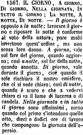 | Il giorno, A giorno, Di giorno, Nella giornata, In tutto il giorno; La notte, A notte, Di notte - Il giorno è opposto a la notte; lavorare il giorno e riposare la notte è conforme al voto della natura; pure molti invertono quest'ordine, ma non senza loro danno. A giorno, vale sul fare del giorno, quando aggiorna; così a notte, sul far della notte, quando annotta. Di giorno, vale durante il giorno, cioè quando il sole rischiara il nostro emisfero, che ci si vede chiaro; così di notte, quando è scuro e che a vedervi chiaro ci va il lume di lucerna o di candela. Nella giornata e in tutto il giorno sono affinissimi, meno quando col primo s'intendono quelle otto, dieci o dodici ore di lavoro che compongono la giornata dell'operaio. [immagine] |