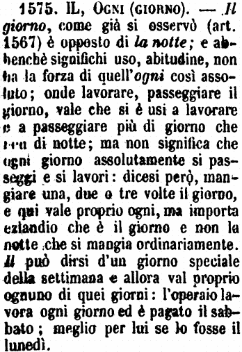 | Il, Ogni (giorno) - Il giorno, come già si osservò (art. 1567) è opposto di la notte; e abbenchè significhi uso, abitudine, non ha la forza di quell'ogni così assoluto; onde lavorare, passeggiare il giorno, vale che si è usi a lavorare e a passeggiare più di giorno che non di notte; ma non significa che ogni giorno assolutamente si passeggi e si lavori: dicesi però, mangiare una, due o tre volte il giorno, e qui vale proprio ogni, ma importa eziandio che è il giorno e non la notte che si mangia ordinariamente. Il può dirsi d'un giorno speciale della settimana e allora val proprio ognuno di quei giorni: l'operaio lavora ogni giorno ed è pagato il sabbato; meglio per lui se lo fosse il lunedì. [immagine] |