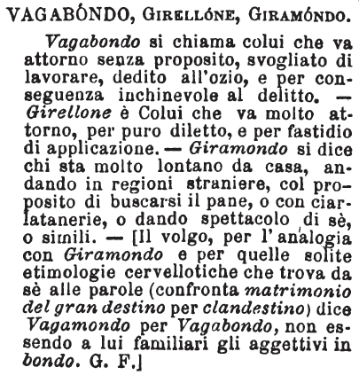 | Vagabondo, Girellone, Giramondo - Vagabondo si chiama colui che va attorno senza proposito, svogliato di lavorare, dedito all'ozio, e per conseguenza inchinevole al delitto. - Girellone è Colui che va molto attorno, per puro diletto, e per fastidio di applicazione. - Giramondo si dice chi sta molto lontano da casa, andando in regioni straniere, col proposito di buscarsi il pane, o con ciarlatanerie, o dando spettacolo di sè, o simili. - [Il volgo, per l'analogia con Giramondo e per quelle solite etimologie cervellotiche che trova da sè alle parole (confronta matrimonio del gran destino per clandestino) dice Vagamondo per Vagabondo, non essendo a lui familiari gli aggettivi in bondo. G. F.] [immagine] |